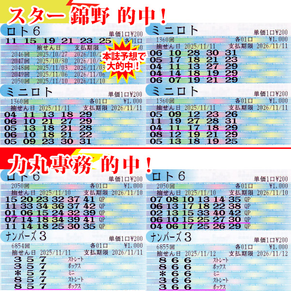 10日(月)、やりましたよー! 週明けロト6で4等ゲット‼ しかも本誌予想から‼ 「たくみ」錦野、やるときはやるんです! うれしーっ! 対する専務は5等2口をQPで軽やかにゲット‼ 続くナンバーズ3では、当せん数字「256」を「155」グランドスラムで狙ってた専務。風車盤百の位「1」の隣が「2」、一の位「5」の隣が「6」なんですよーっ! 思わず「何コレッ‼」と専務。