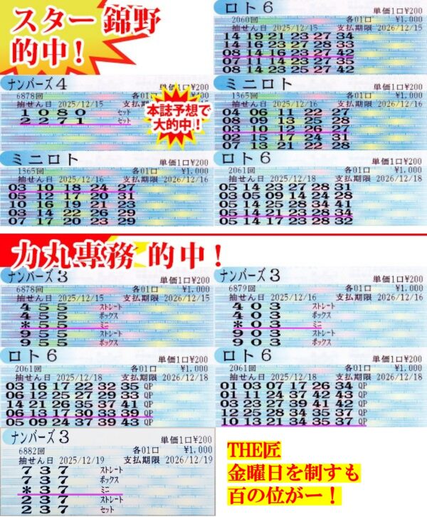 達人☆スター錦野旦の『この世に数字がある限り!』2025年12月20日更新コラムをご紹介。錦野さんと力丸専務がどのように数字を選んでいるのか、当たりの予兆はあるのか、当たるためにしていること など、ご参考にどうぞ!