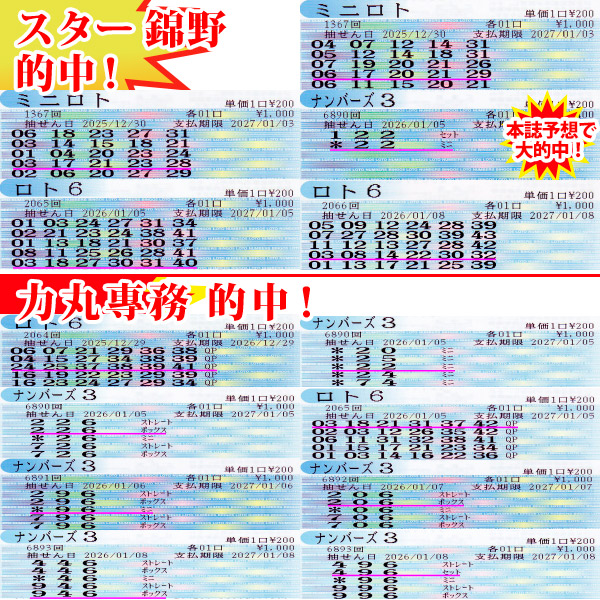 1月5日(月)、2026年最初の抽せん。まずはロト6で僕は自力で5等2口当せん‼ さらにナンバーズ3では当せん数字「622」を僕の本誌予想「122」でミニゲット‼ えっ⁉ 初当たりが本誌! やったあーっ‼ 喜んでいたら、専務に「立派なもんだ!」とほめられました‼ うれしーっ‼ その専務もロト6で4等をQPで引いてきます! 昨年最終、今年最初ともQPで4等! 引き良すぎでしょ‼ するとこの引きが次なる当たりを! ナンバーズ3「622」を「226」グランドスラムでボックスゲット! さらに十の位「2」に自信のあった専務「22」ミニも買っていてのダブル当せん‼ ナンバーズ4でも当せん数字「7526」を「7529」狙いで、あわや初当たりでストレートまでありました! 6日(火)は、昨日の勢いそのままに専務がナンバーズ3で当せん数字「696」を「796」グランドスラム狙いでミニゲット! ナンバーズ4も当せん数字「2300」を「4023」で買っていて、思わず叫ぶ専務!