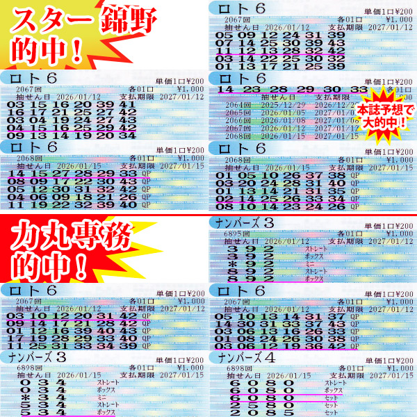 15日(木)、まずはロト6で僕が5等3口! うち1口は僕の本誌予想が大的中! やったね☆ さらにほか2口はQPで引きました! たまにはQPもいいですね♪ 対する専務はナンバーズ3でやってくれました! 当せん数字「345」を「534」グランドスラム狙いでボックスゲット! さらにナンバーズ4でも当せん数字「8060」を「6080」ボックス、セットボックスに大当たり! まさに年明けから跳ねてますねー!