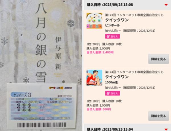 クイックワンはピンボール10枚2000円と1500m走10枚1000円だ。当せん結果は、ピンボールで4等2000円、6等200円2本当たり2400円回収で+400円。