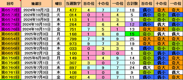 過去の大阪抽せん水曜日の当せん数字を10回分さかのぼって書き出しました。