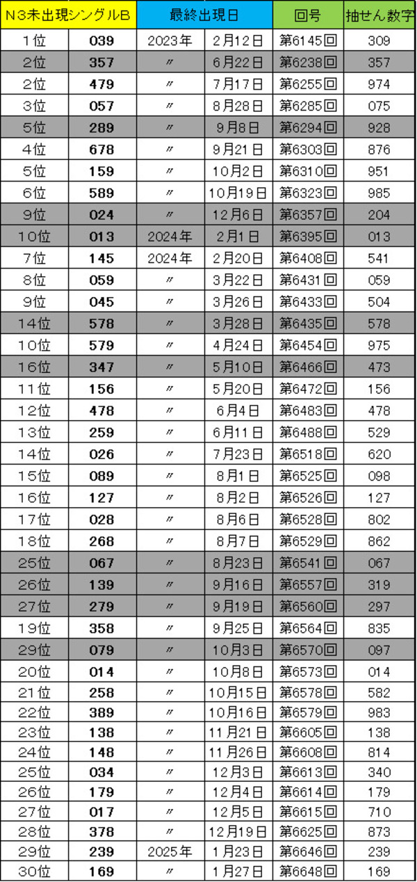 第6857回(11月14日)時点のN3長期未出現シングルボックス数字